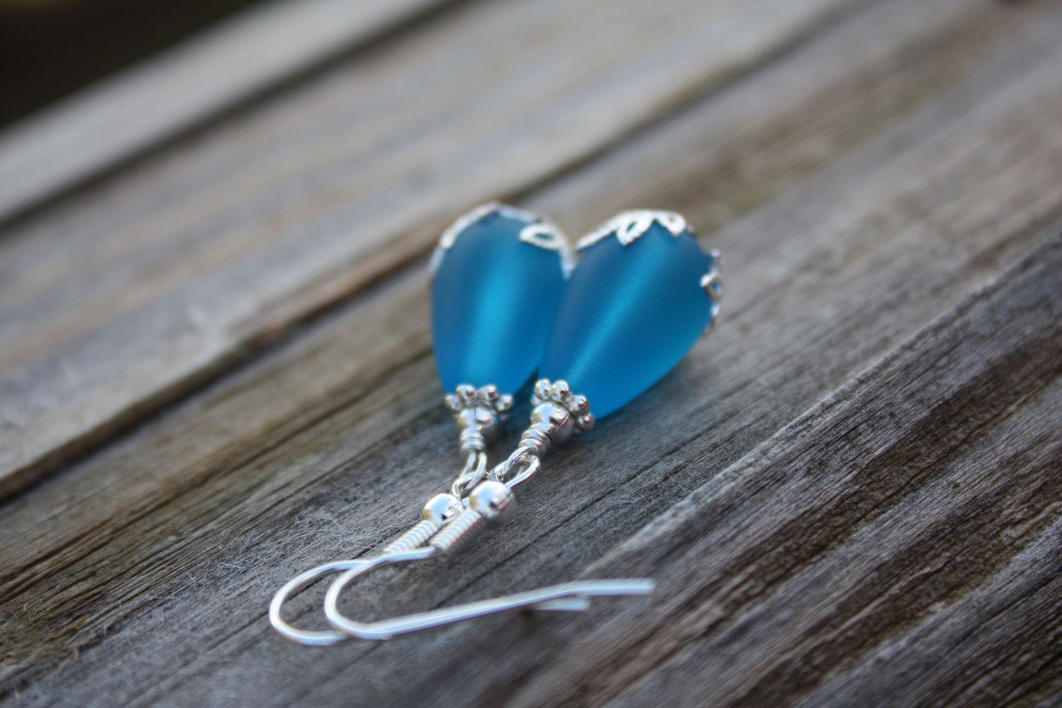 These vibrant blue sea glass drop earrings captures the glistening blue of the ocean with incredible aqua colored stones. You can customize these cultured blue earrings with your choice of sterling silver, gold filled, gold plated, or silver-plated material to suit your personal style and budget. Easily combined with a variety of cool tone outfits, these elegant earrings are also a lovely option for beach brides looking to add a shimmering touch to their wedding day ensemble.